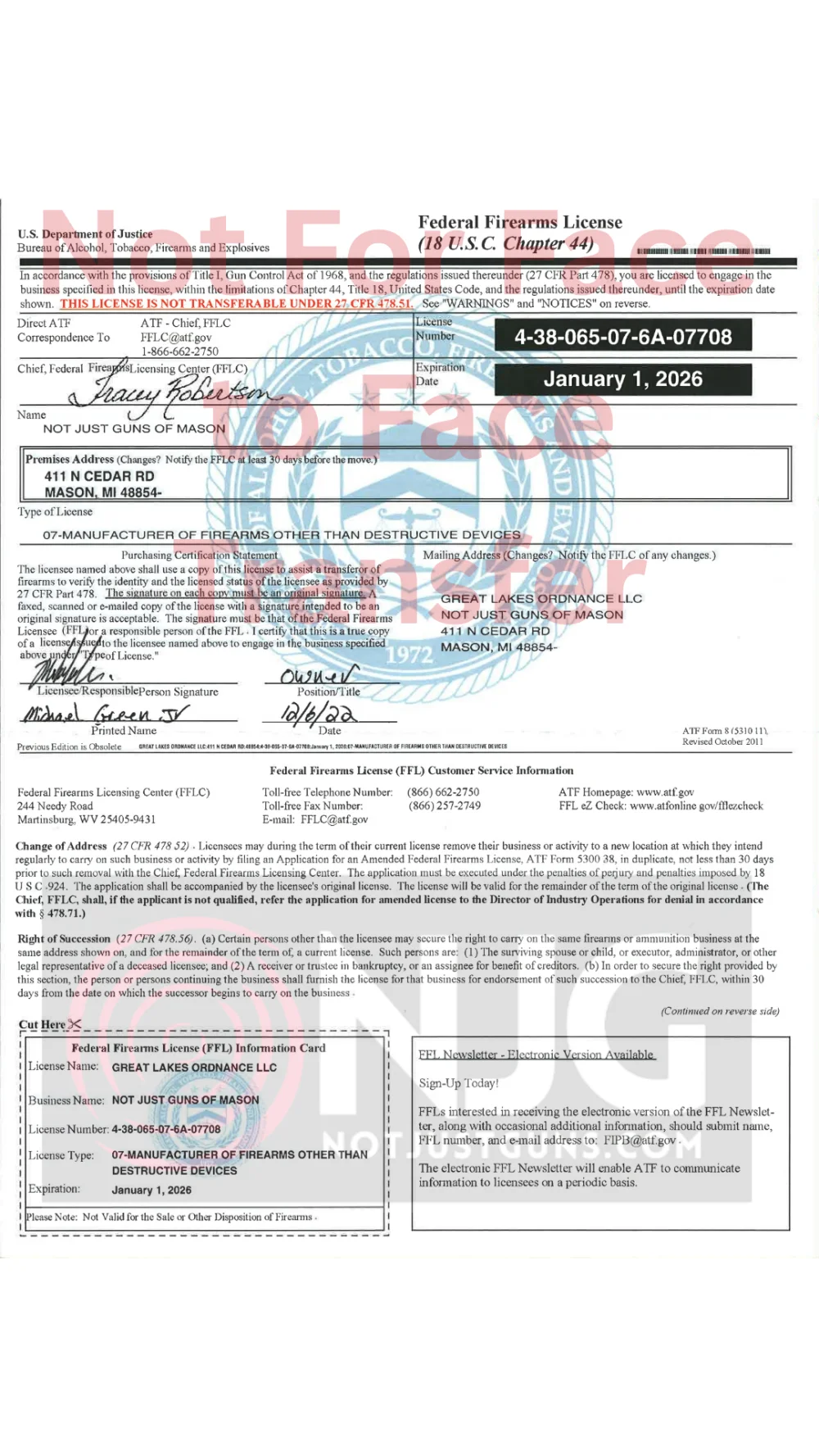 Not Just Guns of Mason is a full service gun store open 6 days a week. We aim to be the good guys in the gun business. We treat all our customers with the highest level of service and respect. We carry a complete line of all major brands of firearms and accessories. We also are your one stop shop for NFA products.